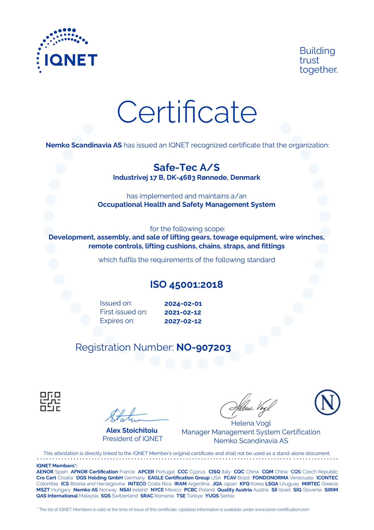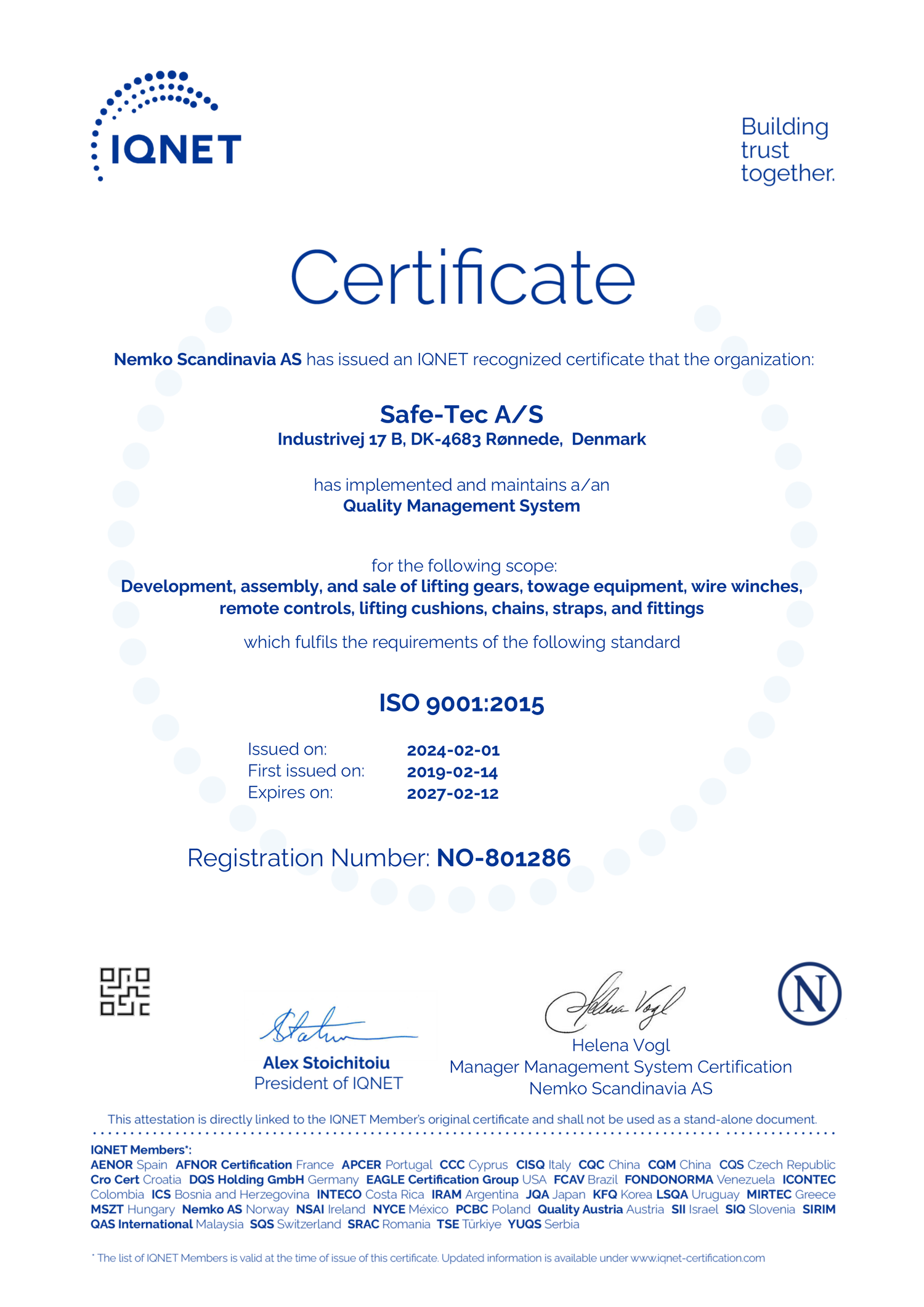 As a customer of Safe-Tec A/S, you can expect products and services of a high, consistent quality. We are certified to the ISO9001:2015 standard, which means that both processes, subcontractors and employees are geared to work continuously to ensure high quality.